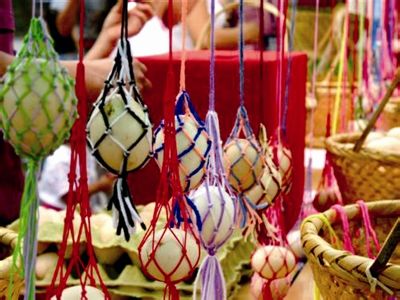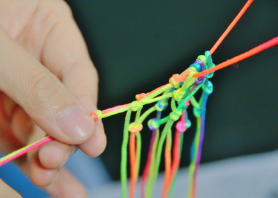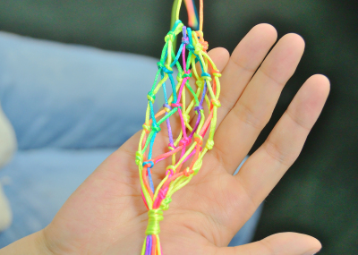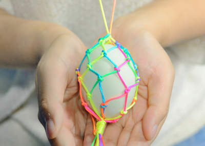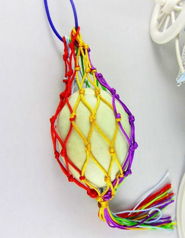 2.相邻的两根线在相距前一根结1厘米处打结,两边剩下的线打一个结,这样就成环状,以此类推,大约到5-8层(视蛋大小)