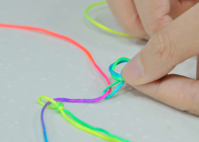 1.依各人喜好,选用单色或五彩丝线,每根剪成长80厘米左右,8根即可。将一根线对折打结后,作为挂脖子上的线。拿一根线穿于该线上,对折后在1厘米处打结。按照此方法一次将7根线全部穿上。