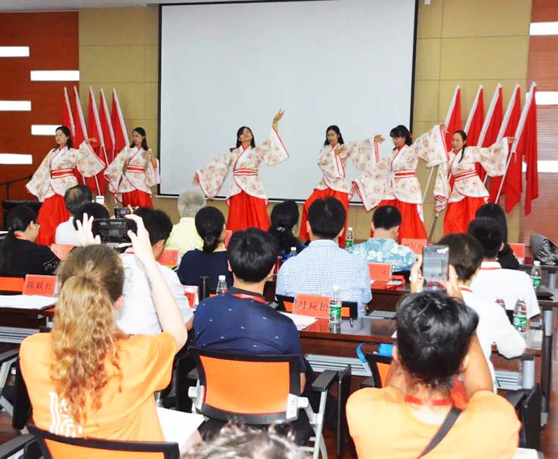 我市传统文化协会的部分会员,为到场的学生表演了舞蹈《礼仪之邦》,小学生们齐声背诵了《孝经》的部分段落。 随后,一段古琴和萧的合奏曲《梅花三弄》,让外国的学生们还没正式学习,就感受到我国传统文化的氤氲意境。