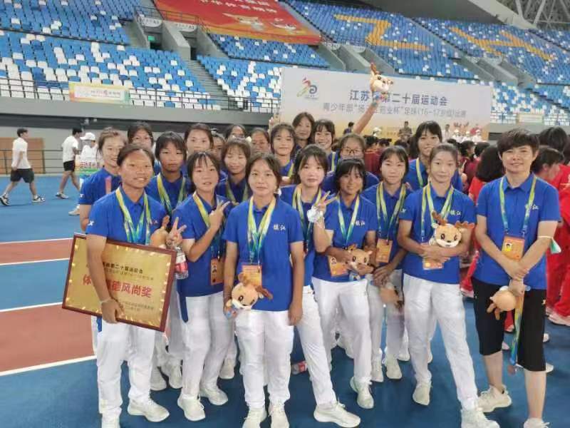 022年7月1号——7月7号,在泰州举行的江苏省第二十届运动会青少年女足比赛中,我市女足代表团在主教练卢爱雪的带领下奋勇拼搏,最终获得第三名,为镇江市代表团再添两枚金牌(集体项目第三名计两枚金牌),并被大会组委会评为“体育道德风尚奖”。