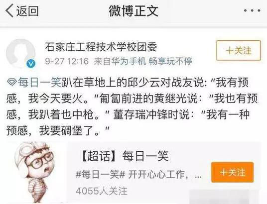 9月30日,全国烈士纪念日。就在烈士纪念日的三天前,河北一学校团委官方微博竟恶搞邱少云、黄继光、董存瑞3位烈士,把烈士的壮烈牺牲编辑为每日一笑的笑话,侮辱烈士,这一点也不好笑。